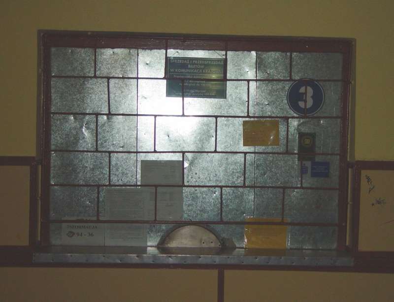 Poczekalnia na dworcu i okienko kasy biletowej.