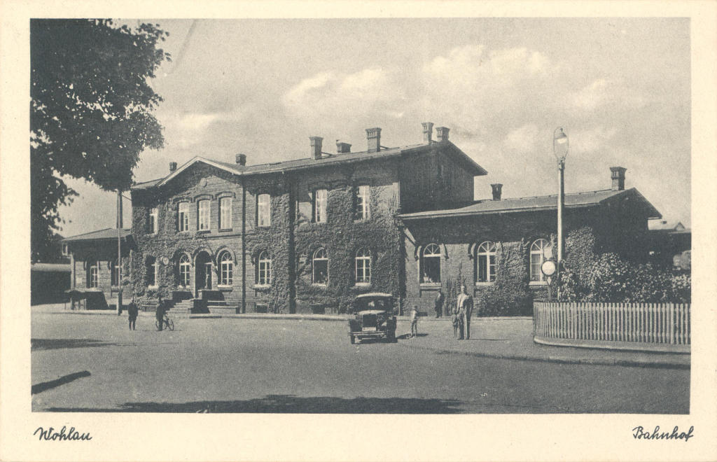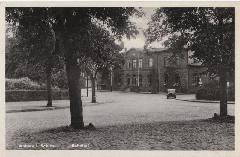 Bahnhof Wohlau - XIX/XX wiek. Niemiecka widokówka z widokiem dworca od strony dojazdu oraz postoju dorożek.
