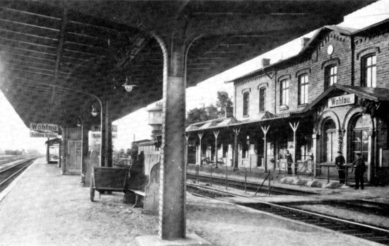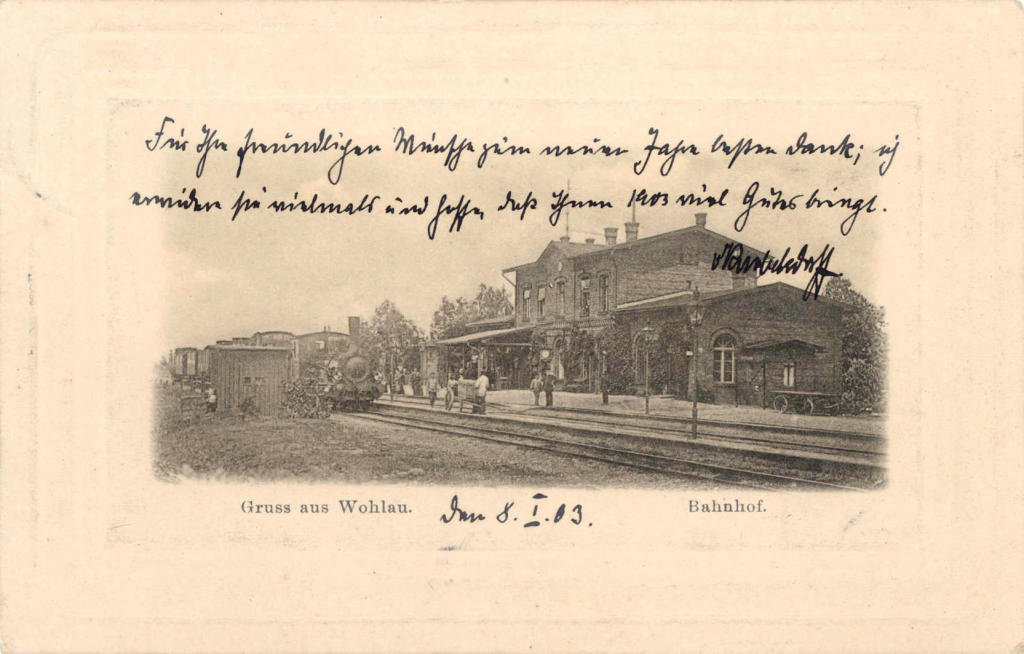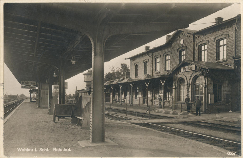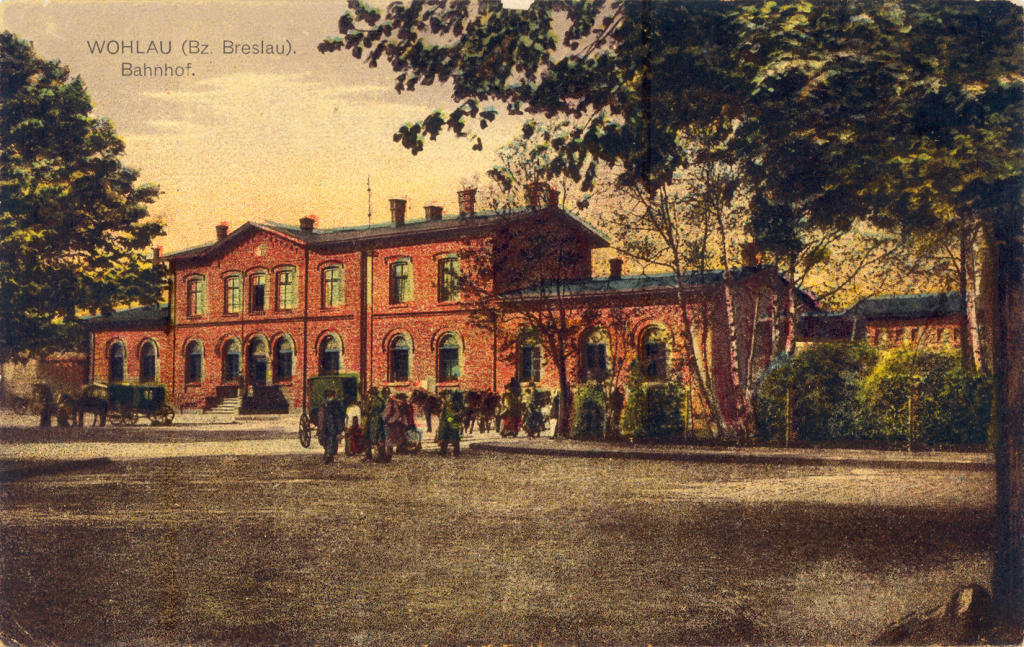 Bahnhof Wohlau - bardzo wczesny. Jeszcze nie zbudowano wiaty na peronie… a parowozy były nie "dzisiejsze". Widok w kierunku północnym, od strony wjazdu z Wrocławia, przed budową linii z Malczyc.