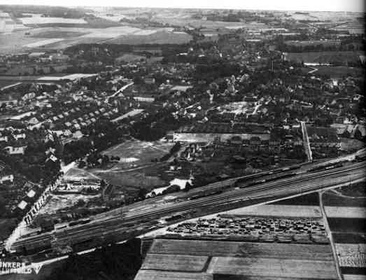 Budynek dworca i perony. Widok w kierunku północnym, od strony wjazdu z Wrocławia, przed budową linii z Malczyc. Ze zbiorów Adama Pacześniaka.