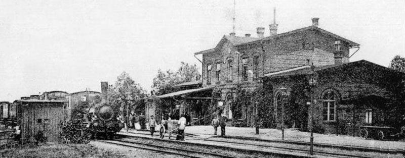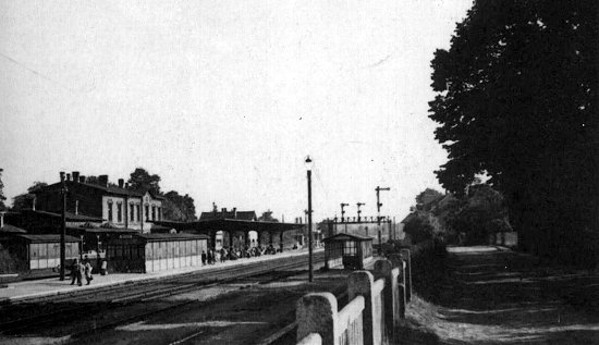 Budynek dworca i perony. Widok w kierunku północnym, od strony wjazdu z Wrocławia, przed budową linii z Malczyc. Dworzec bez wiaty peronowej i chyba z gazowym oświetleniem. Ze zbiorów Adama Pacześniaka.