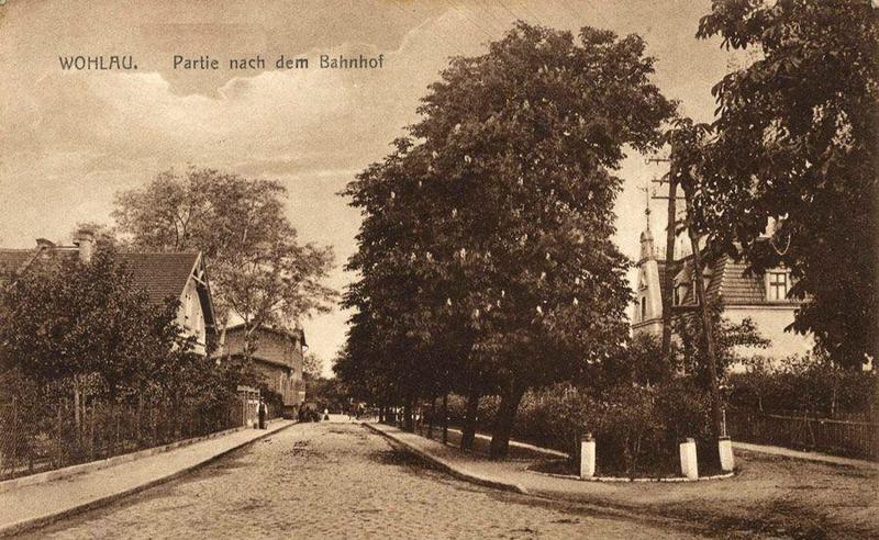 Wohlau - Bahnhofstr. - 1916 rok. Dworzec kolejowy - wówczas Bahnhof - na końcu ulicy, po lewej stronie.