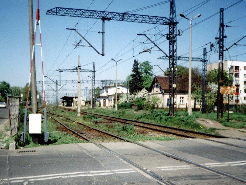Stacja PKP w Wołowie. Widok z przejazdu kolejowego przez ul. Wojska Polskiego, od strony wjazdów z Wrocławia i (kiedyś) Malczyc. Z prawej widoczne dzikie dojście do peronu 1. Kierunek północny.