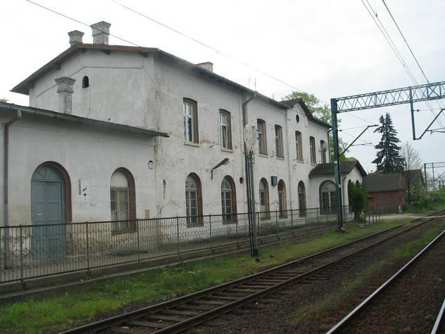 Budynek stacyjny od strony peronów i wjazdu ze Ścinawy. Widok w kierunku południowo-wschodnim.