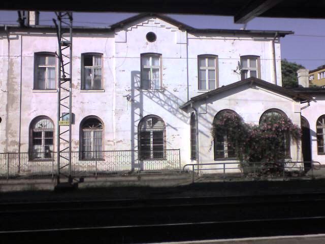 Peron 1 i budynek dworca. Widok w kierunku północnym, od strony wjazdów z Wrocławia i Malczyc. Zachowanie tej elewacji uchroniłoby budynek od szpetnego otynkowania, a jeszcze bardziej od łuszczących się kilku warstw malunku. Ze zbiorów Adama Pacześniaka.