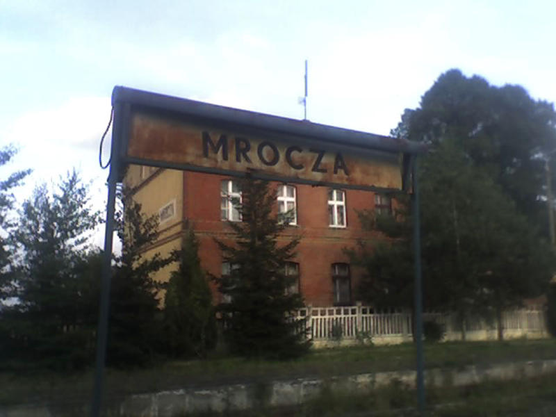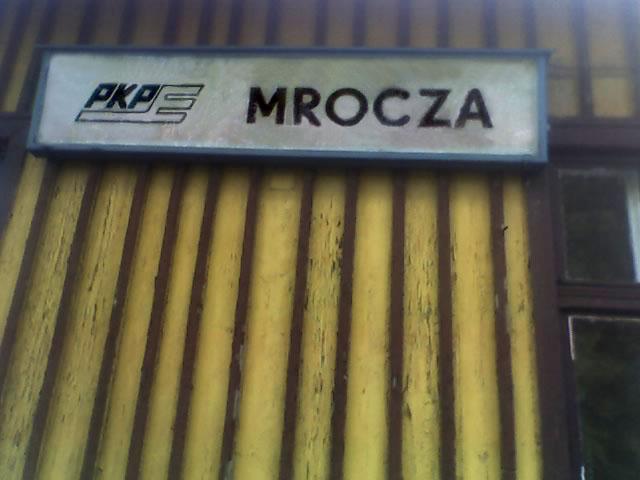 PKP Mrocza. Tablica na budynku dworcowym od strony drogi dojazdowej.