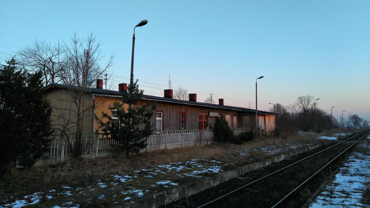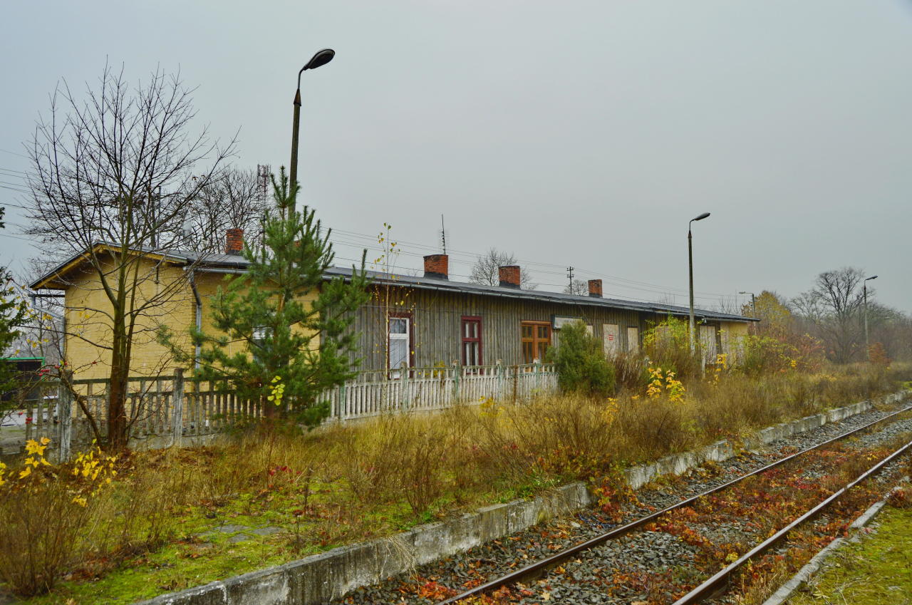 Budynek dworcowy widoczny od strony torów. Widok w kierunku Nakła nad Notecią/Oleśnicy.