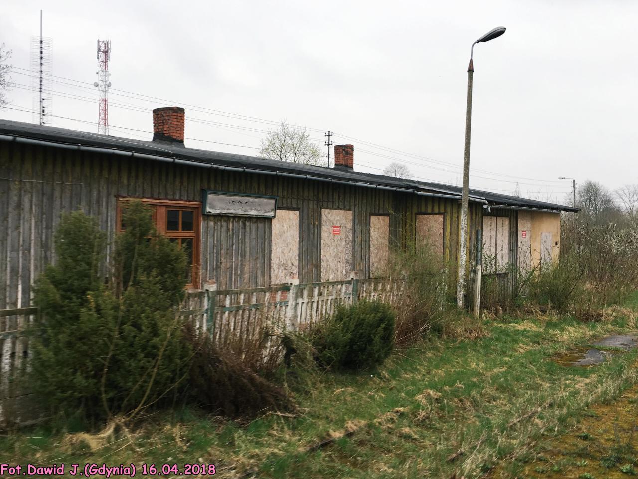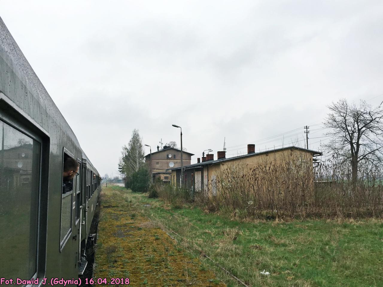 Widok z peronu w kierunku Więcborka/Chojnic. Kolejowy budynek mieszkalny (ul. Dworzec 2), budynek WC i budynek dworcowy, znajdują się po prawej stronie. Przejazd specjalny pociągu z parowozem relacji Kościerzyna-Poznań Główny.