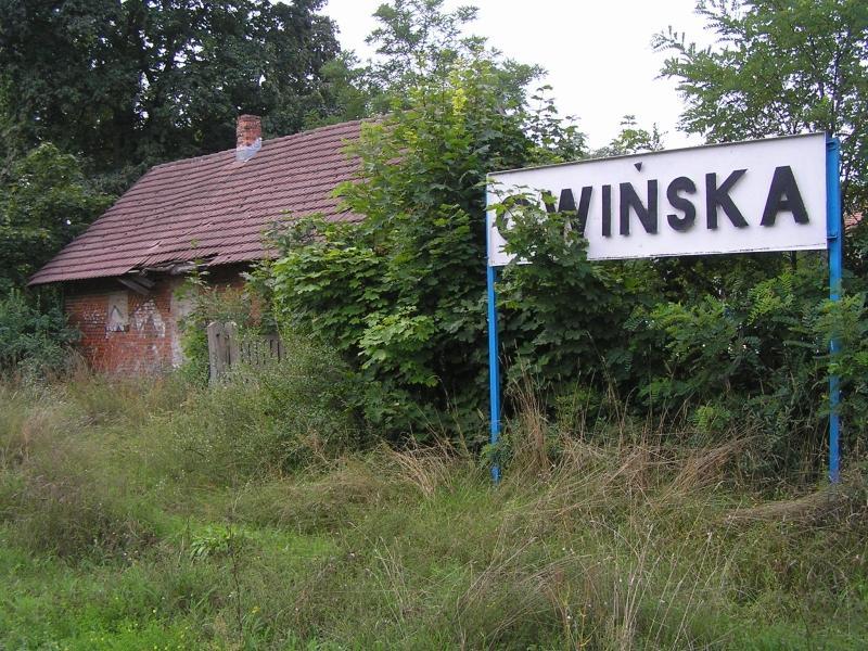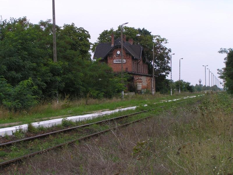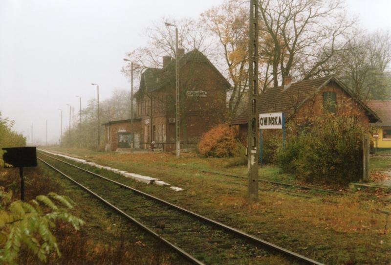 Owińska przed południem. Mała cicha stacyjka czasami przejedzie tu autobus szynowy. Z lewej strony miejsce po rozebranym torze dodatkowym. W oddali przy budynku dworca małe pomieszczenie nastawni zamienione na garaż.