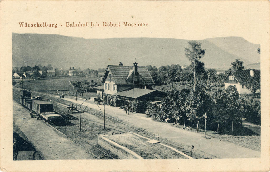 W prawym polu budynek dworca od strony peronu: w prawo koniec torów, w lewo Ścinawka Średnia i kamieniołom piaskowca. Widok w kierunku zachodnim. Ze zbiorów Adama Pacześniaka.