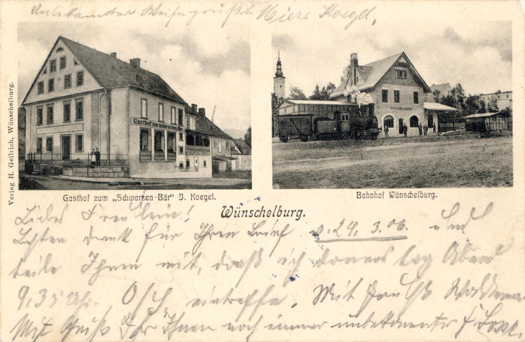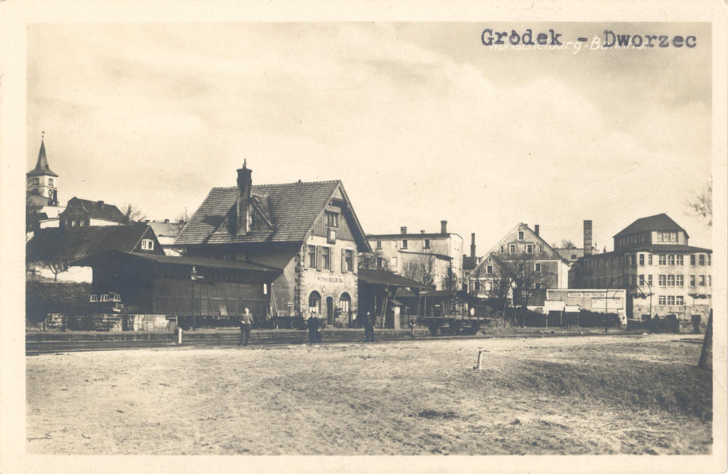 Budynek dworca i magazyn towarowy od strony peronu i wjazdów ze Ścinawki Średniej i kamieniołomu piaskowca. Widok w kierunku północnym. Ciekawostką jest przebitka niemieckiego napisu na polski, z nazwą miejscowości, która obowiązywała raptem przez rok. Ze zbiorów Adama Pacześniaka.