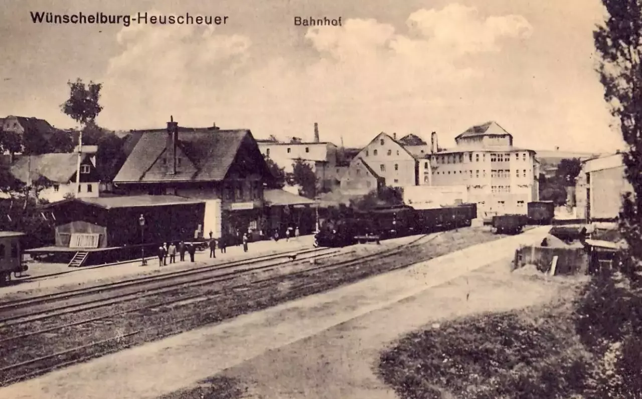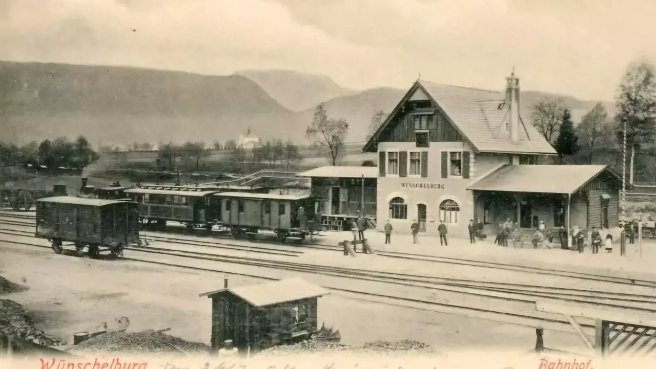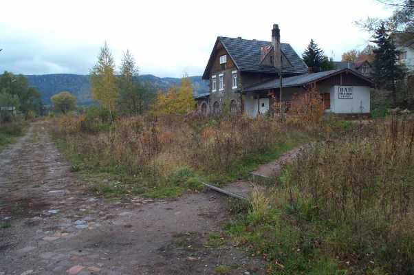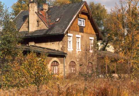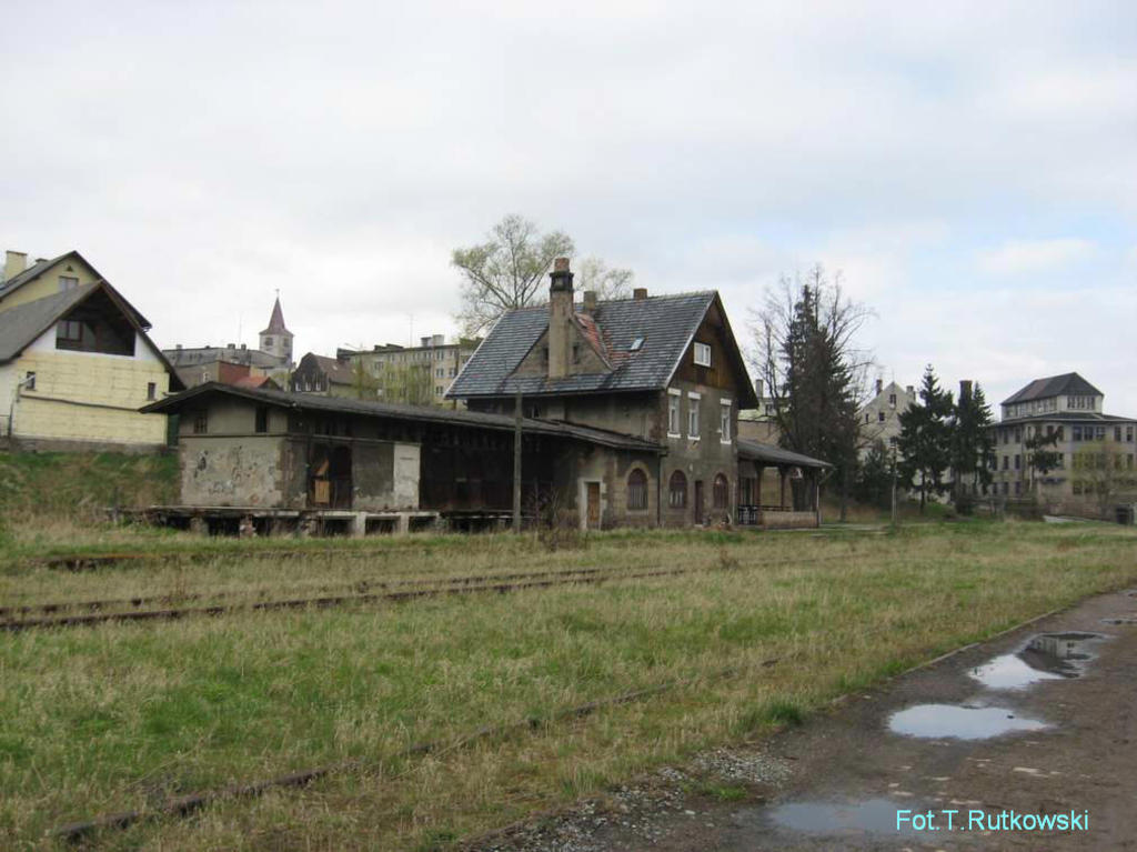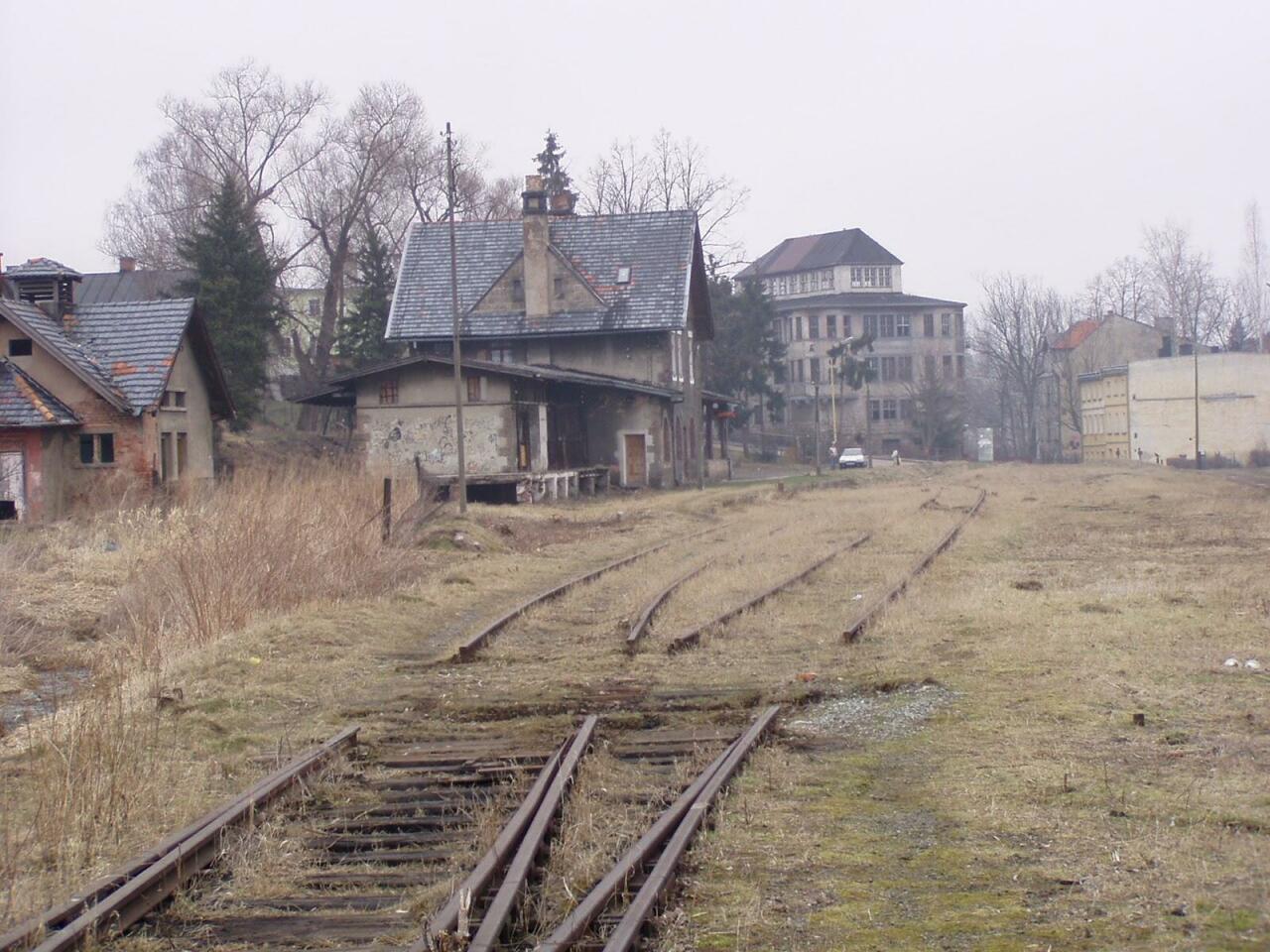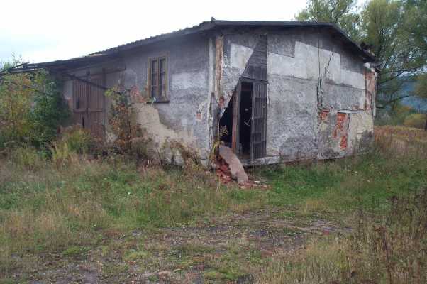 Dawny budynek dworca i magazyn towarowy od strony peronu. Widok w kierunku północno-zachodnim: w prawo był koniec torów, w lewo Ścinawka Średnia i kamieniołom.