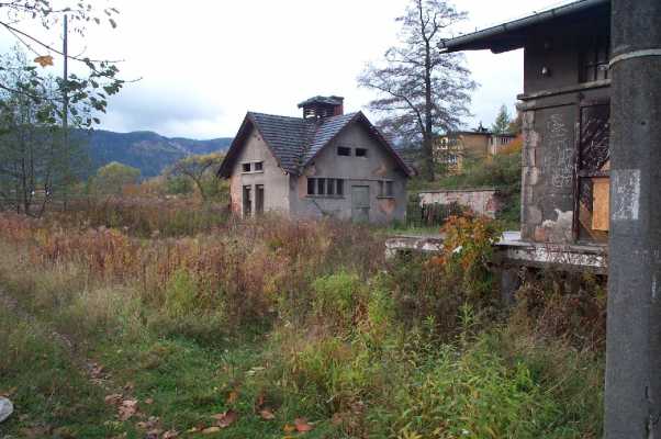 Zrujnowany budynek ubikacji w Radkowie. Widok od strony peronów: w prawo dworzec, w lewo Ścinawka Średnia i kamieniołom piaskowca.