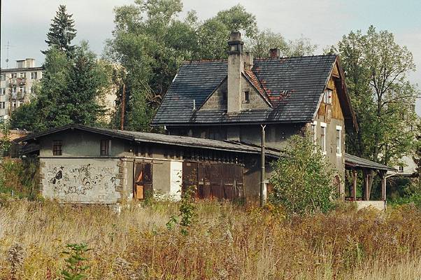 Dawny budynek dworca od strony peronu i początku torów. Widok w kierunku południowo-zachodnim.