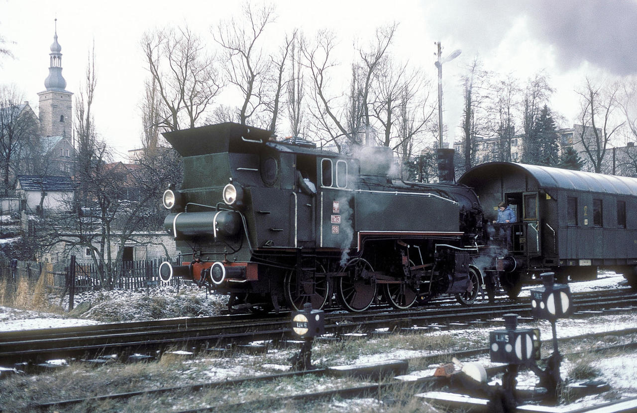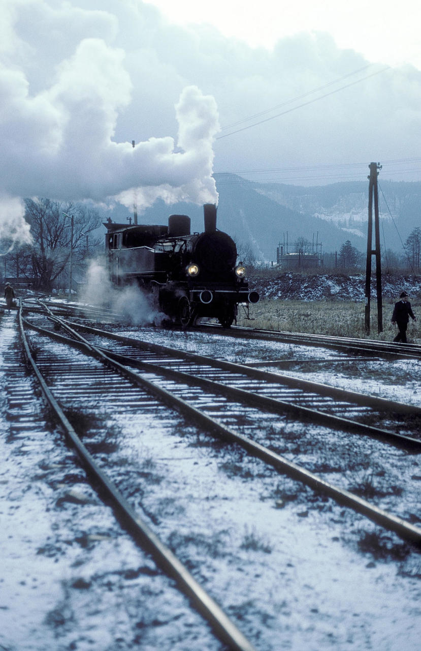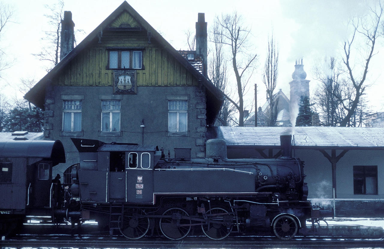 Filigranowy TKi3 na stacji w Radkowie - jeszcze wtedy wykorzystywanej w normalnym ruchu pociągów. Z prawej dworzec i peron. Widok w kierunku południowo-zachodnim, od strony początku torów.