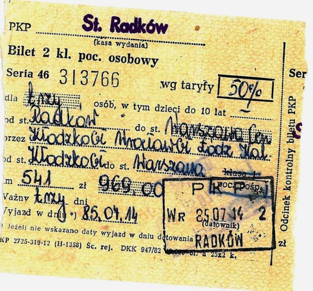 Bilet kolejowy na trasę Radków - Warszawa, wydany na stacji w Radkowie (1985).
