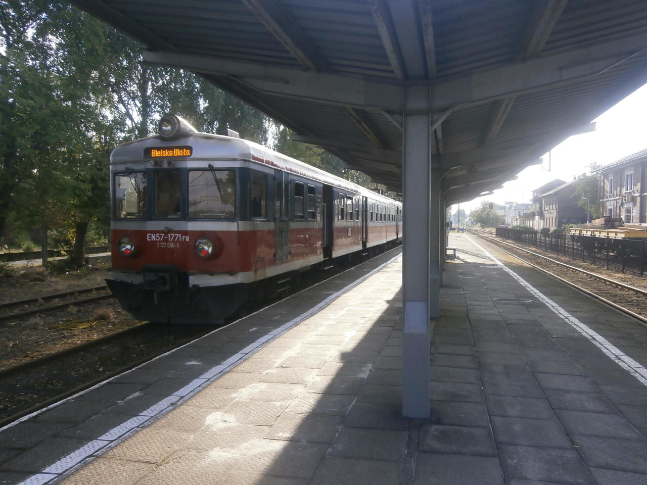 Widok na peron od strony wjazdu z Bielska-Białej. Z lewej dworzec.