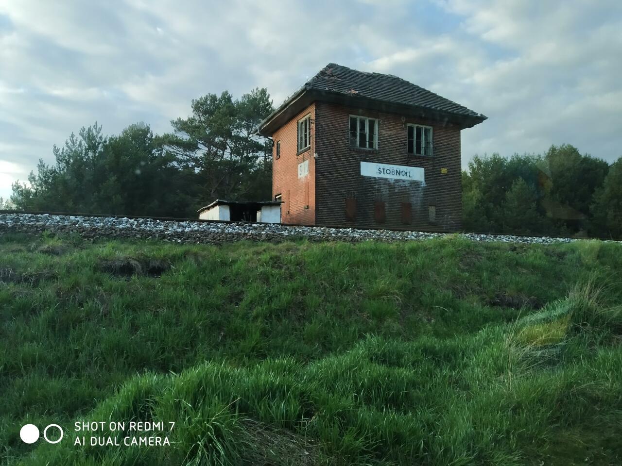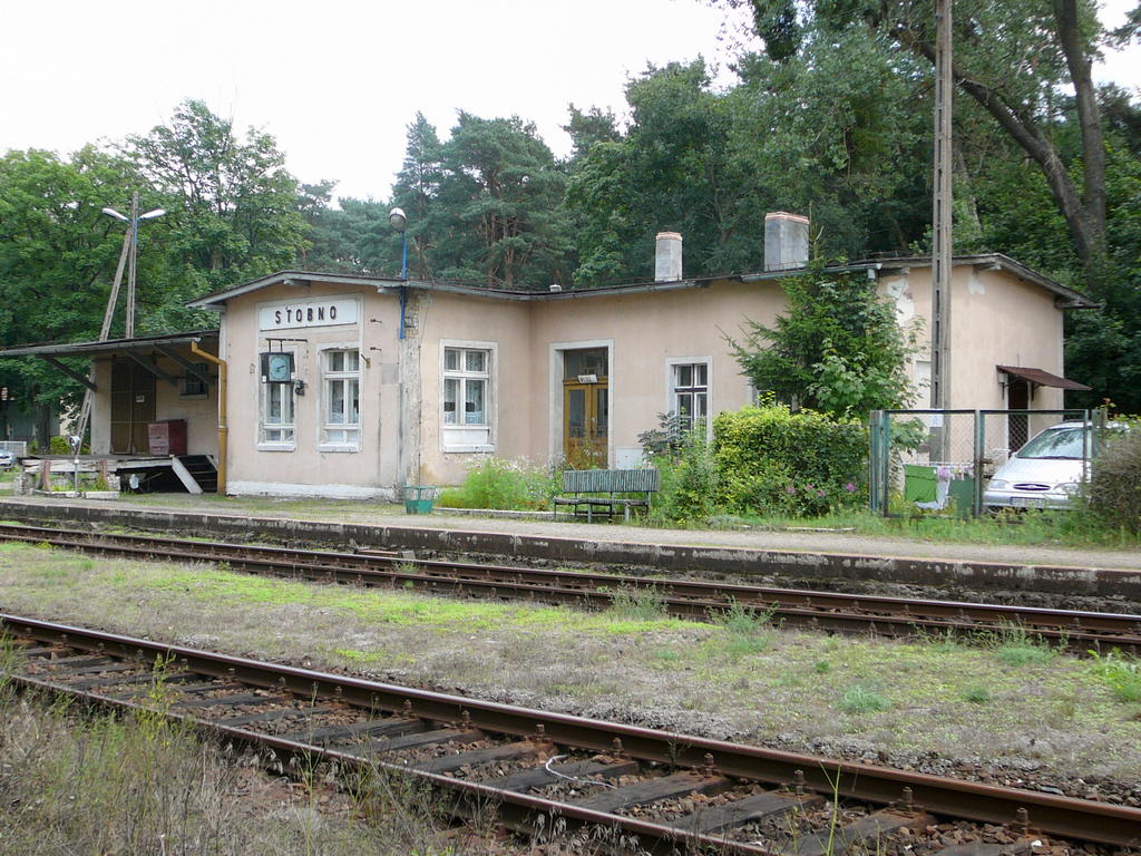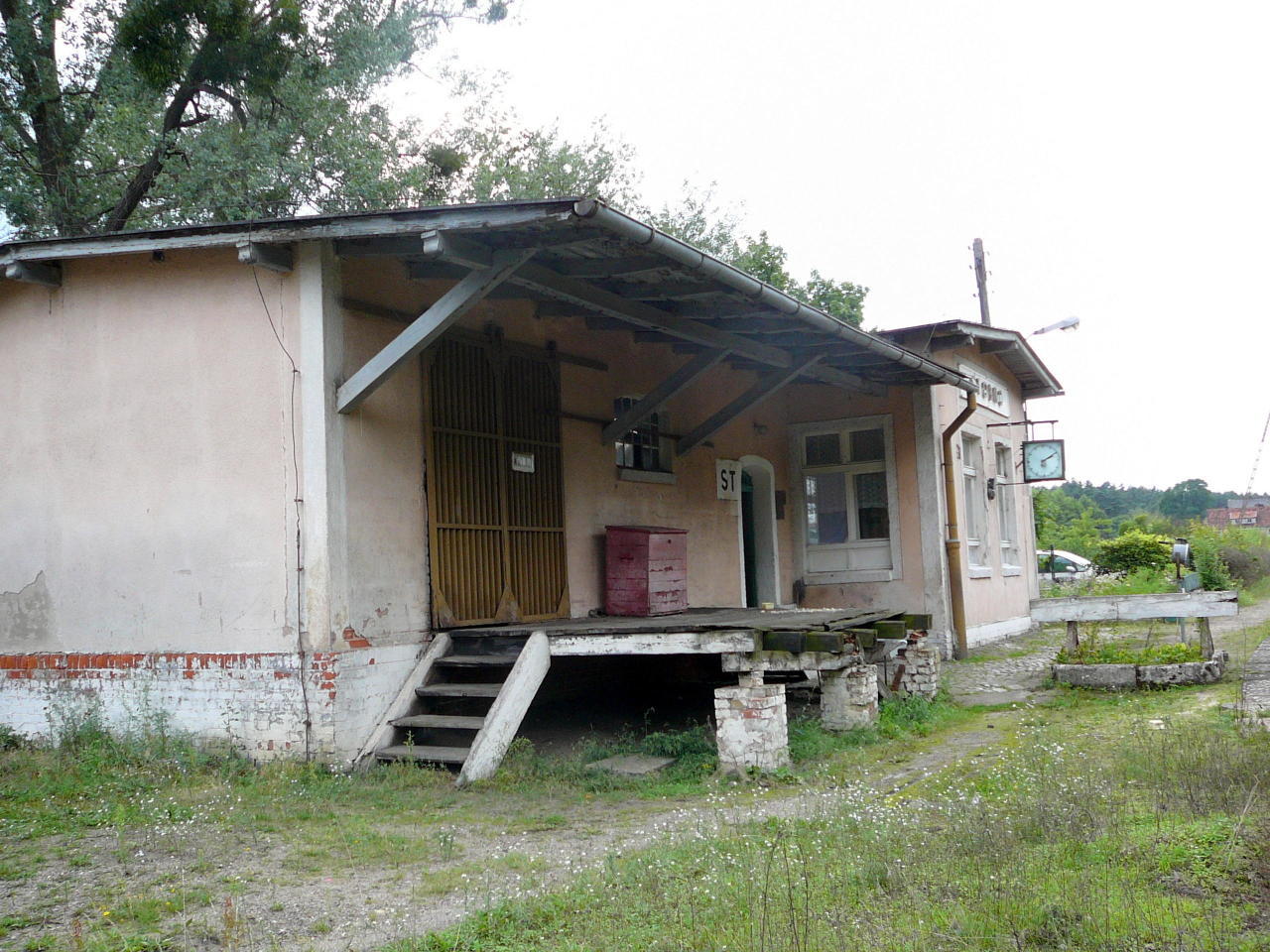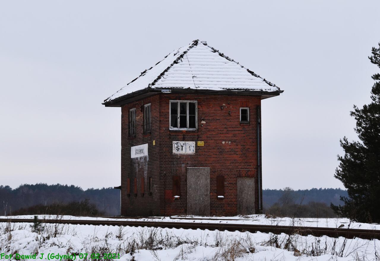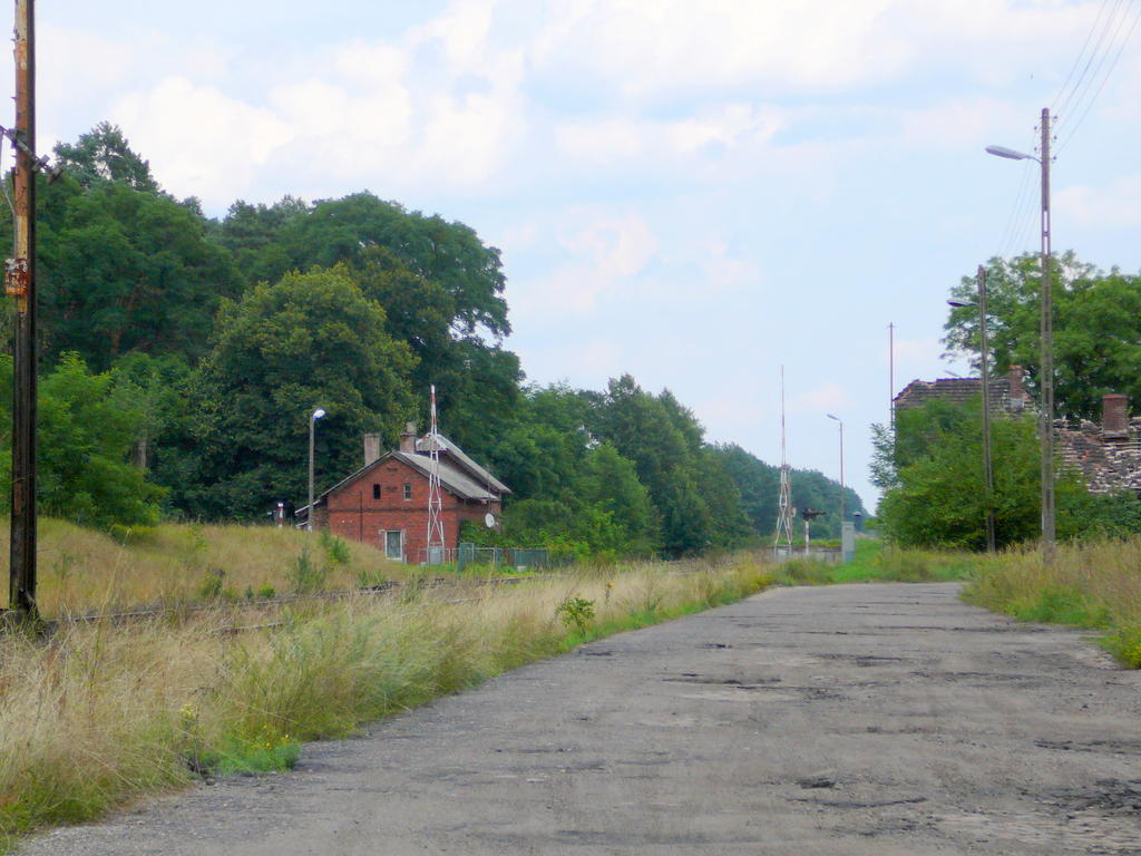 Opuszczona nastawnia wykonawcza ST1. Stoi na wjeździe od strony Krzyża (z lewej). W prawo perony.