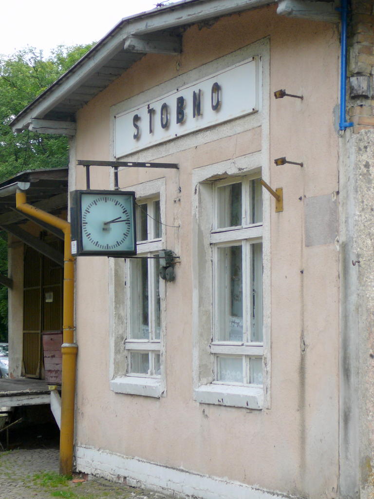 Stobno. Zegar chodzi, punktualnie. Widok na wykusz dworca, mieszczący strażnicę przejazdową, a wcześniej nastawnię dysponującą.