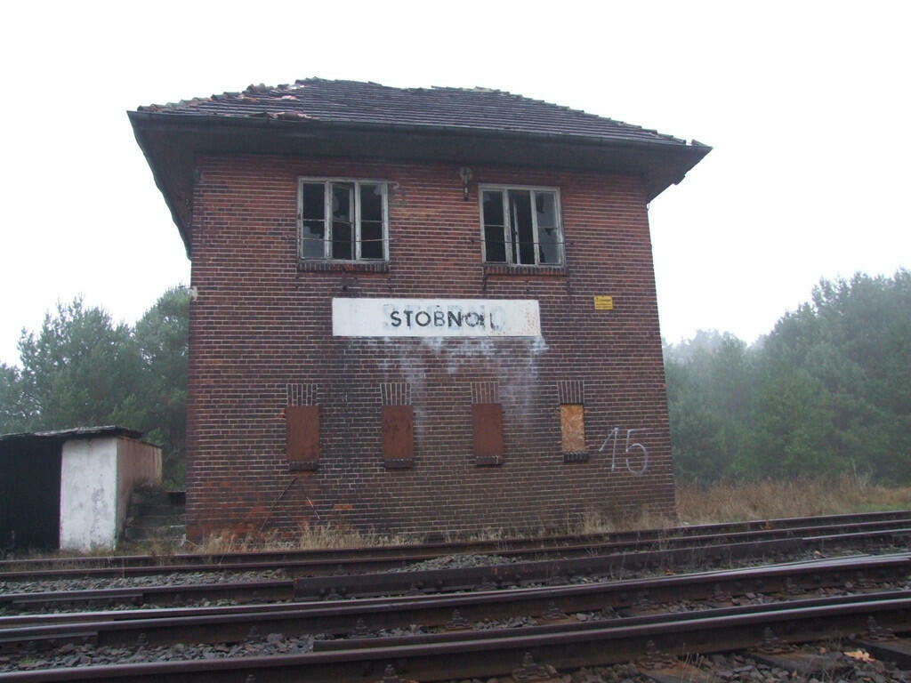 Nieczynna nastawnia wykonawcza w Stobnie. Wjazd od strony Krzyża.