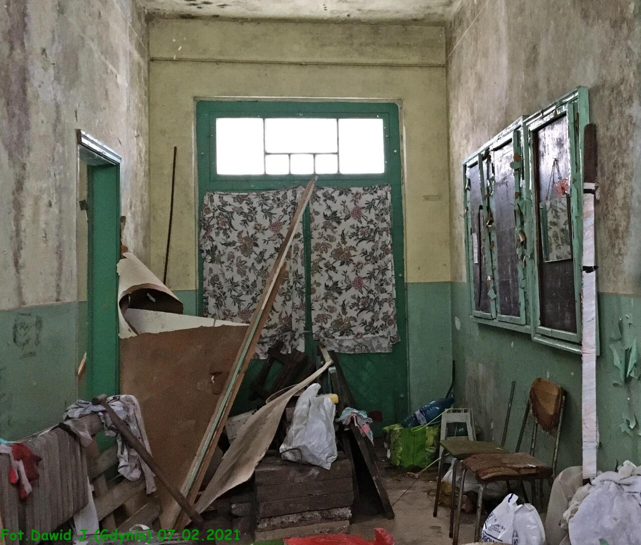 Wnętrze budynku dworcowego. Nieczynna poczekalnia dla podróżnych. Zamknięte wyjście do miejscowości.