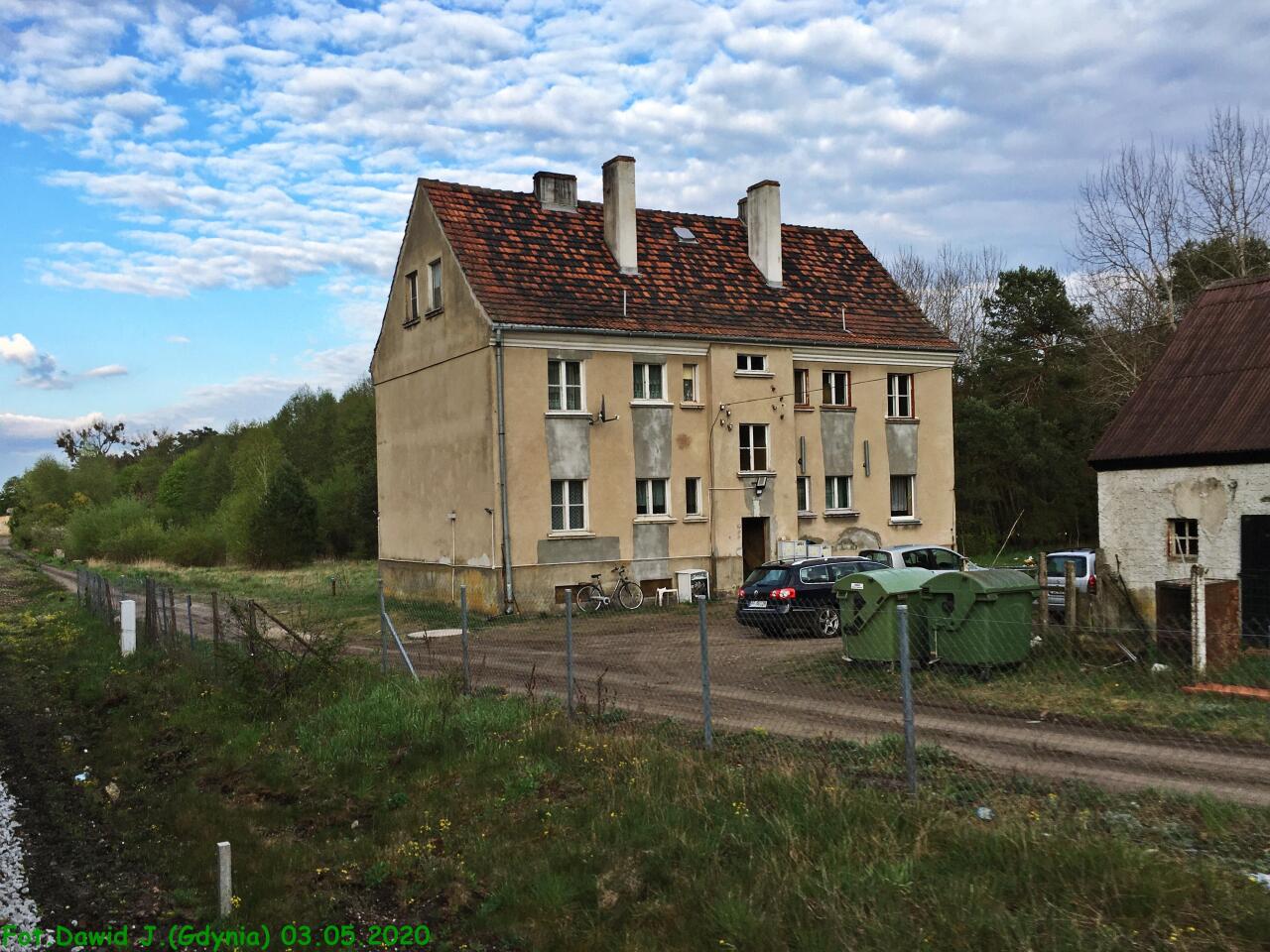 Kolejowy budynek mieszkalny nr 1 widoczny od strony torów. Widok w kierunku Piły Głównej/Tczewa.