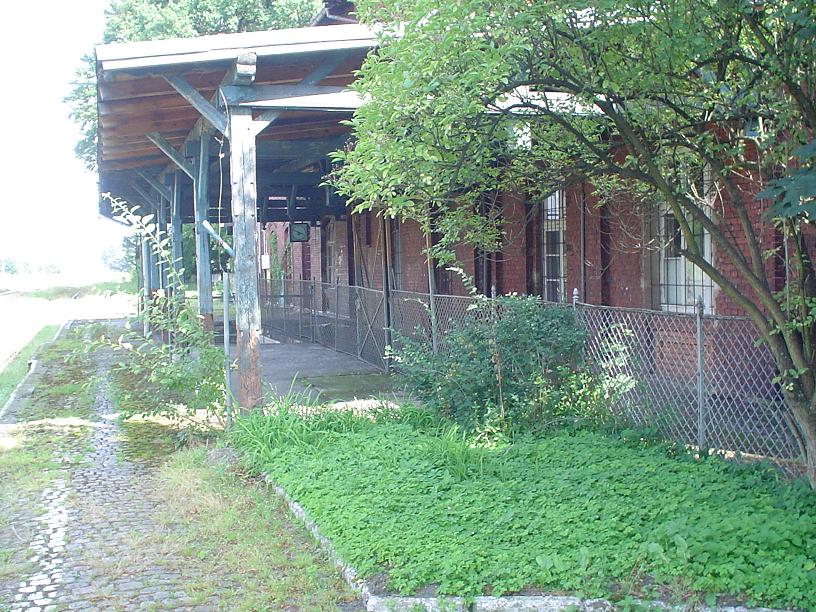 Wiata na peronie 1 i fragment budynku dworcowego. Widok w kierunku wschodnim (Nysa i Bernatice).