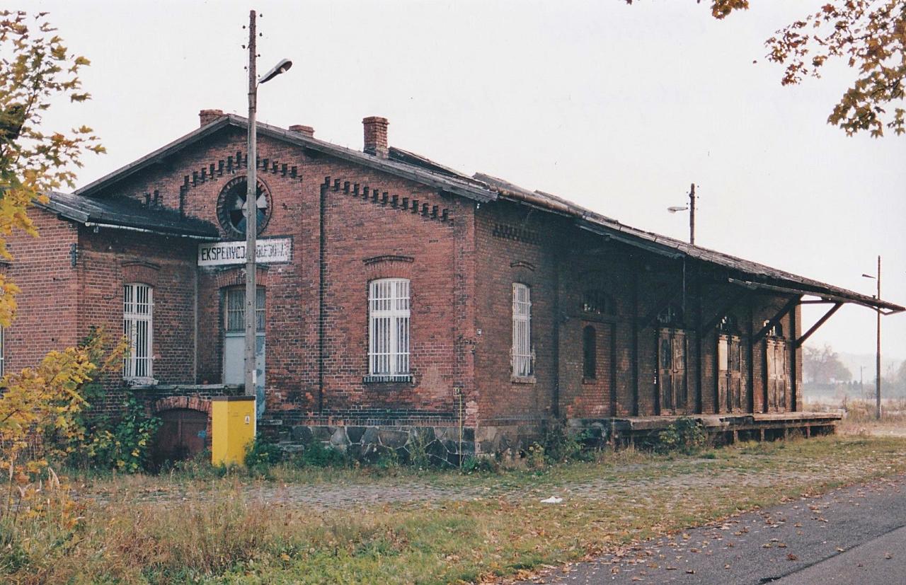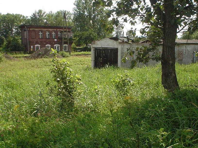 Budynek magazynowy na stacji Otmuchów stojący przy ul. Kolejowej, w południowej części stacji. Widok w kierunku zachodnim (perony).