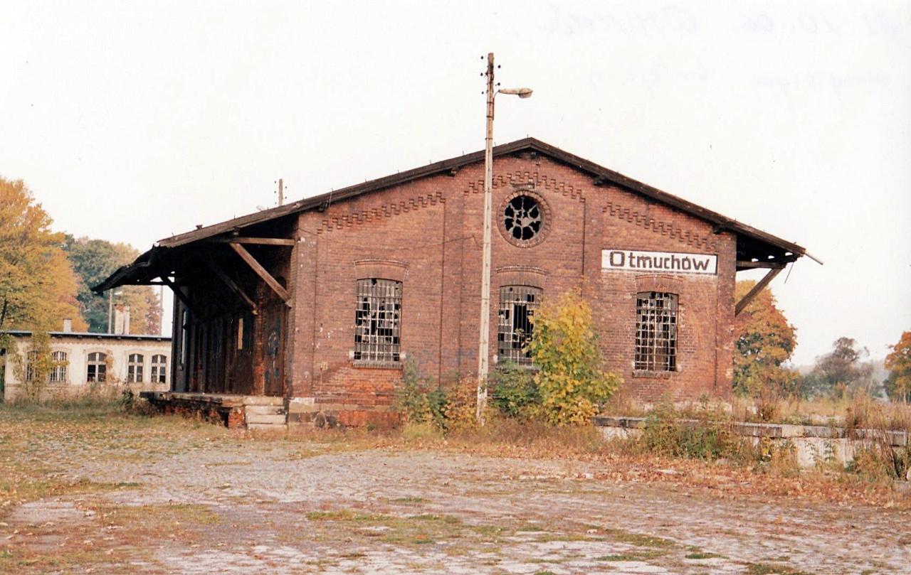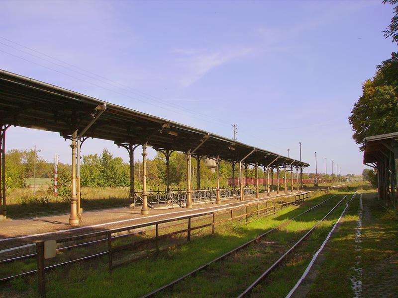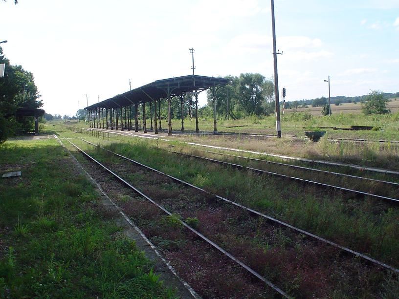 Stacja Otmuchów, z zachowaną wiatą nad peronem drugim. Widok w kierunku wschodnim (Nysa i Bernatice).