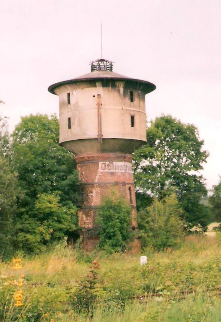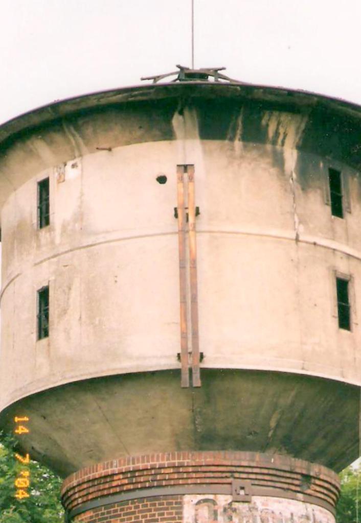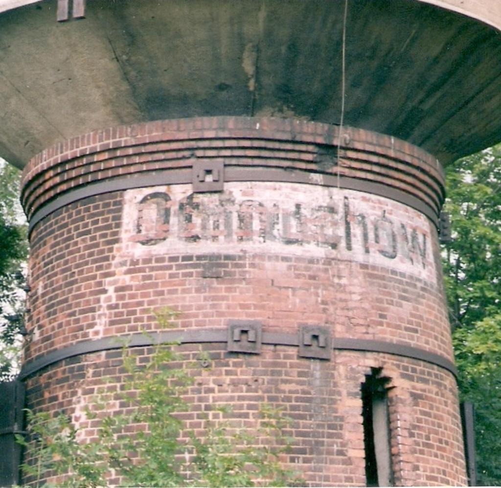 Nazwa stacji i obejmy stalowe wzmacniające trzon wieży wodnej.