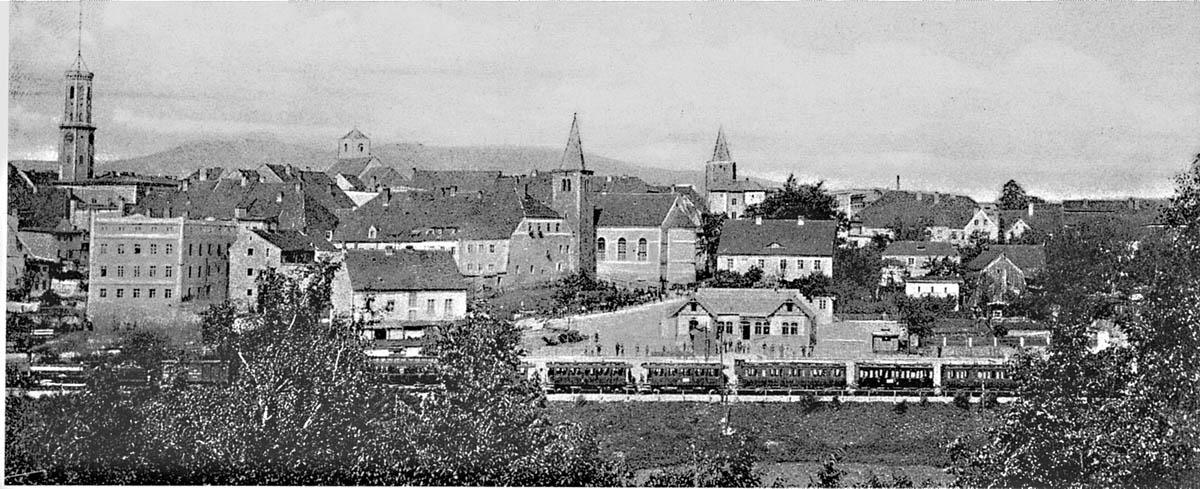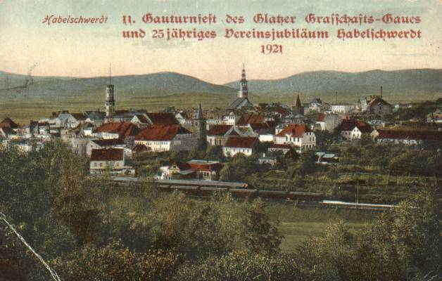 Dawna rycina. Przystanek na tle zabudowy miasta. Kierunek południowo-zachodni; w prawo Kłodzko, w lewo Międzylesie.