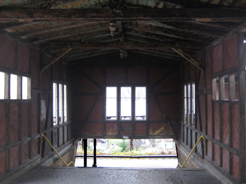 Wejście na perony (w prawo). Niegdyś piękne drewniane zadaszenie dzisiaj jest w tragicznym stanie. A ten dworzec mógłby być perełką Dolnego Śląska! Z lewej strony, niewidoczny dworzec.