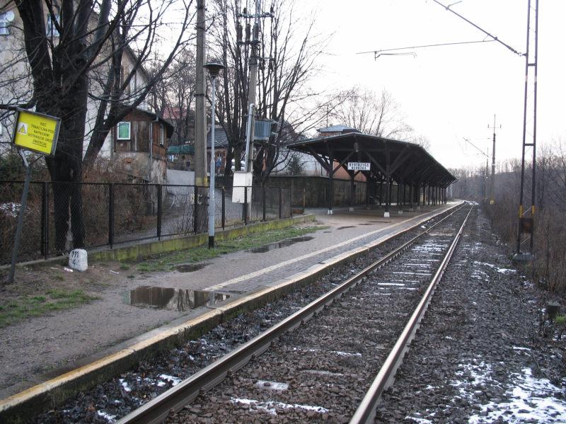 Z poziomu kas (od dawna zamknięte) na peron prowadzą ładnie obudowane schody. Niestety, stan tego "holu" jak i wiaty peronowej pozostawia wiele do życzenia. Widok w kierunku południowym, od strony wjazdu z Kłodzka.