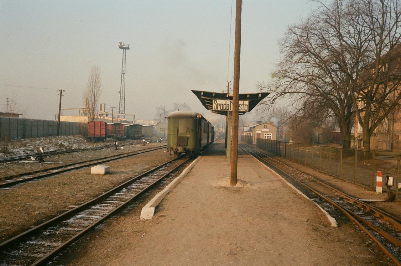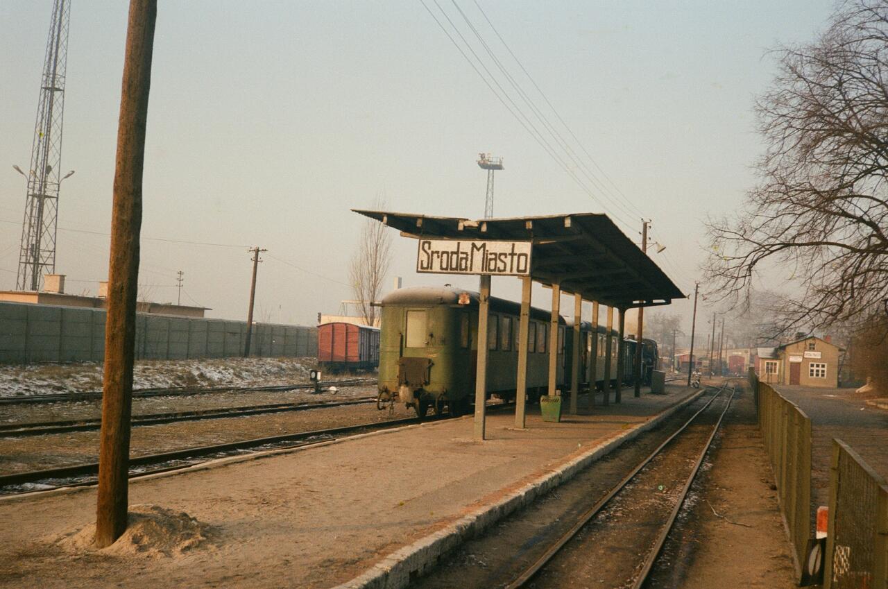 Stacja Środa Wielkopolska Miasto - wjazd z kierunku stacji Poznań Kobylepole Wąskotorowe (odcinek rozebrany), przejazd kolejowy z ulicą M. Niedziałkowskiego (chodnik). Widok w kierunku stacji Zaniemyśl.