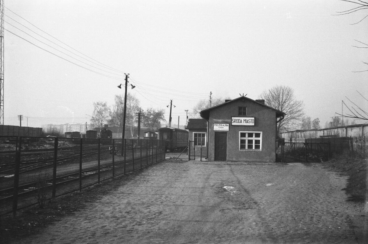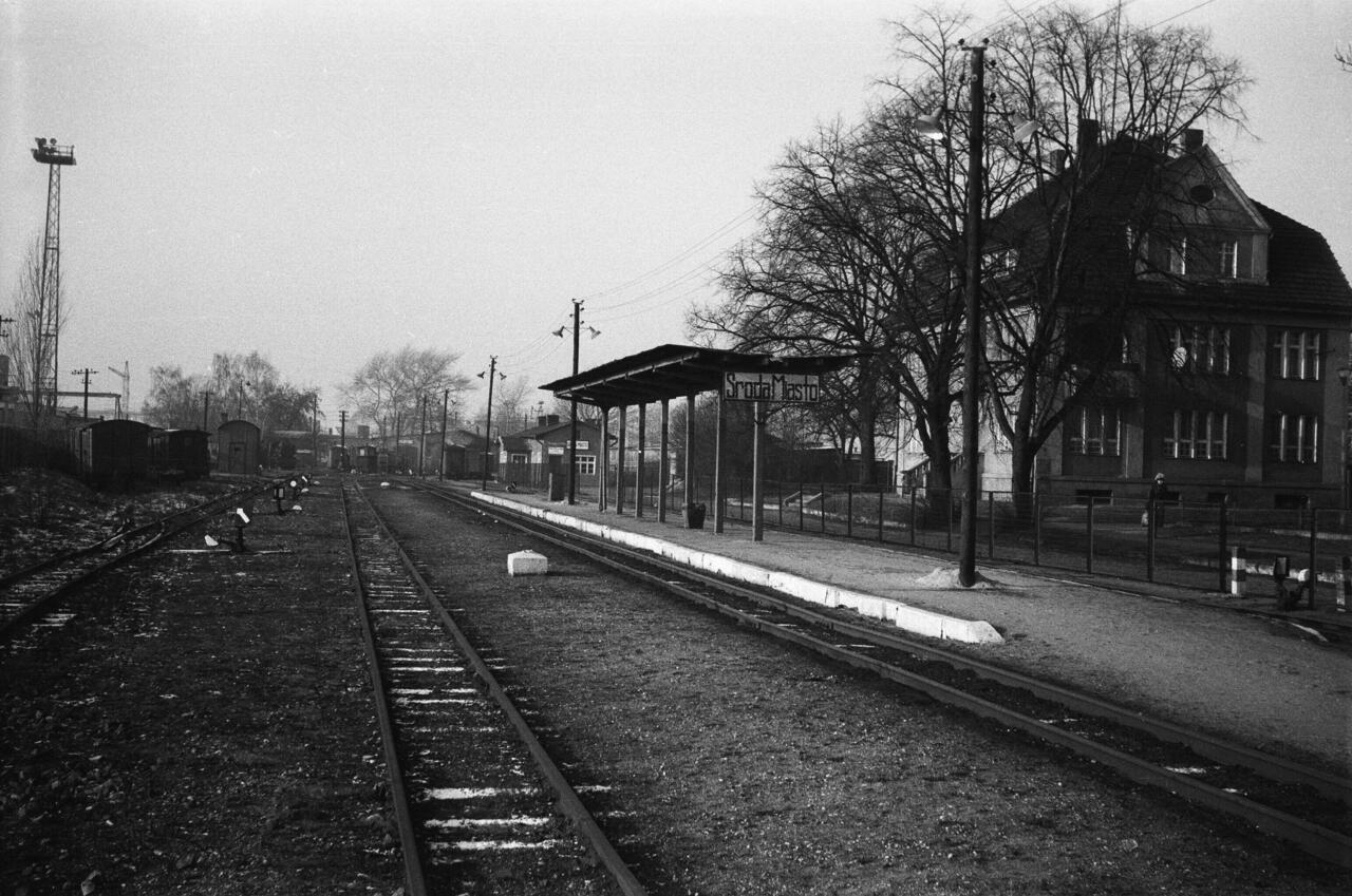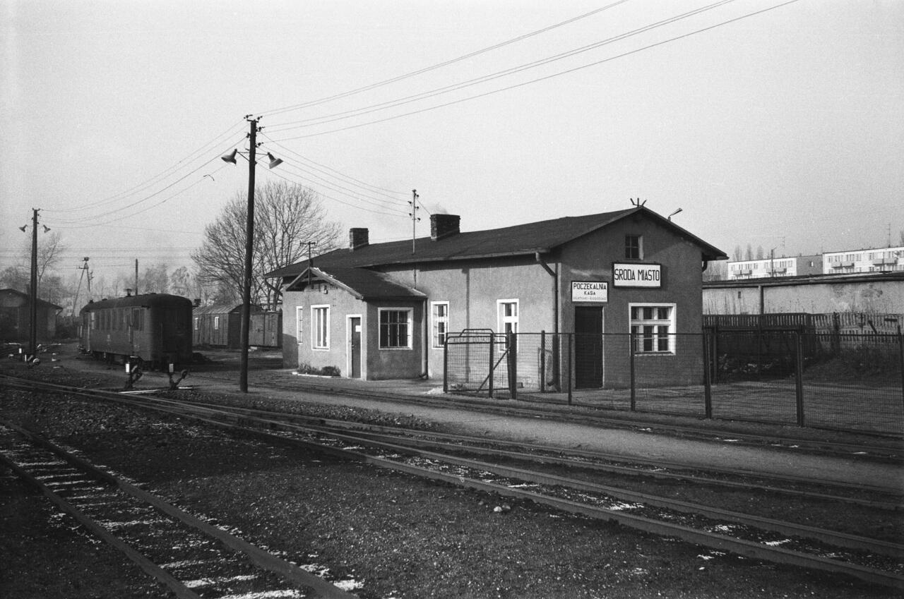 Stacja Środa Wielkopolska Miasto - z prawej strony budynek stacyjny (obok budynku Px48-1756), na wprost - droga rozjazdowa w kierunku stacji Zaniemyśl, na dalszym planie - zabudowania parowozowni.