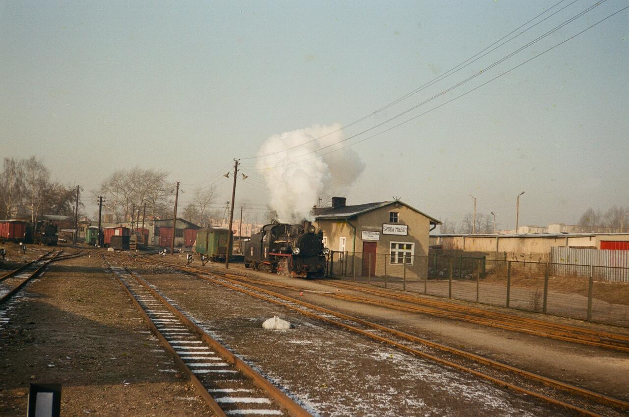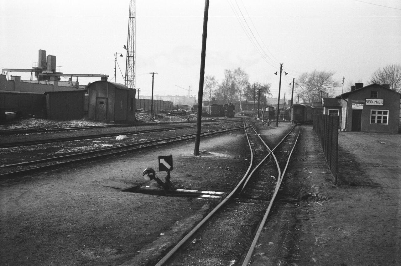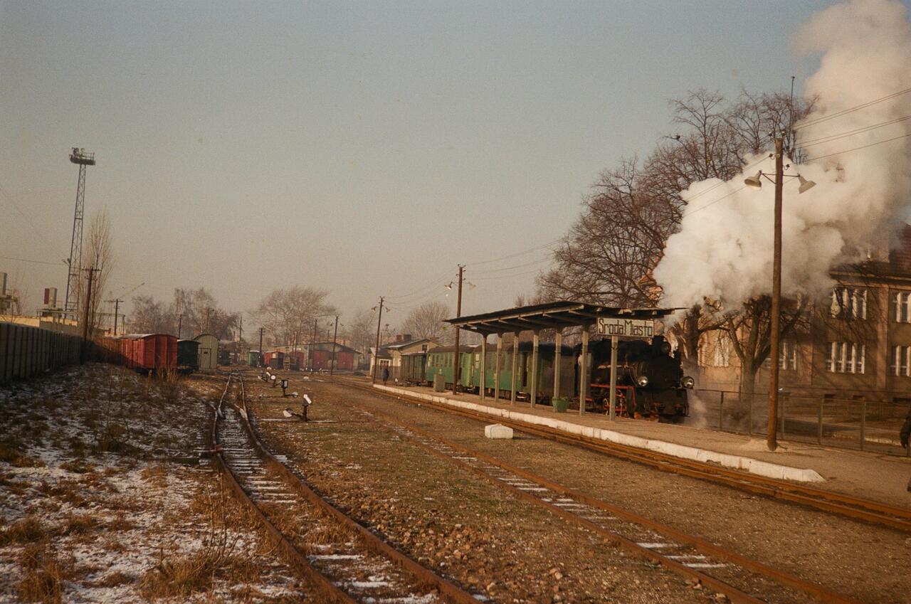 Stacja Środa Wielkopolska Miasto - z prawej strony budynek stacyjny (obok budynku Px48-1756), na wprost - droga rozjazdowa w kierunku stacji Zaniemyśl, na dalszym planie - zabudowania parowozowni.