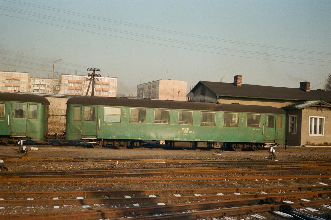 Skład do/z Zaniemyśla stoi na terenie torów trakcyjnych, w tle po lewej lokomotywownia. Widok w kierunku północno-zachodnim, daleko z tyłu widoczne bloki Osiedla Jagiellońskiego.