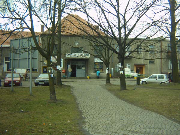 Widok na budynek dworcowy od strony podjazdu w kierunku zachodnim.