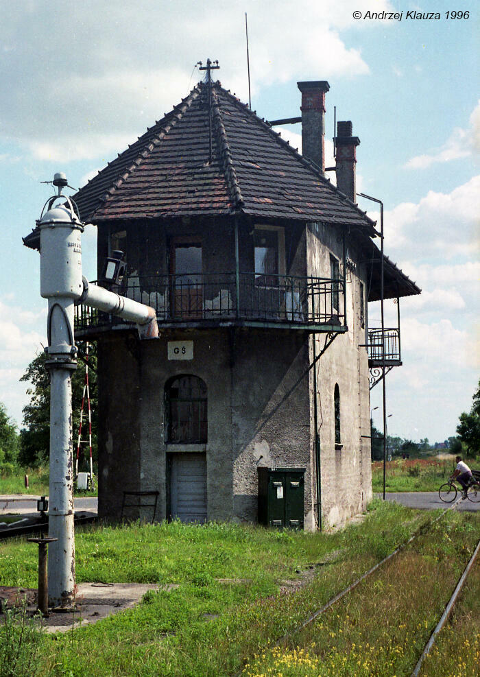 Żuraw wodny i nastawnia dysponująca "Gś" na wyjeździe w kierunku Nysy i Przeworna.