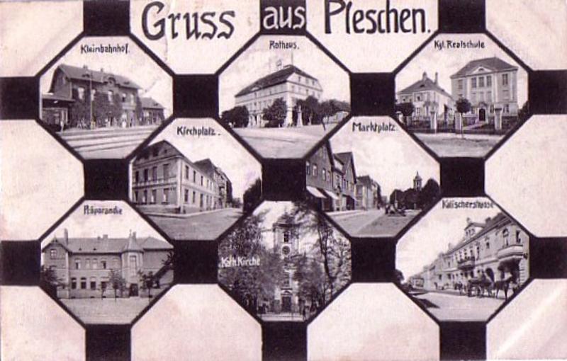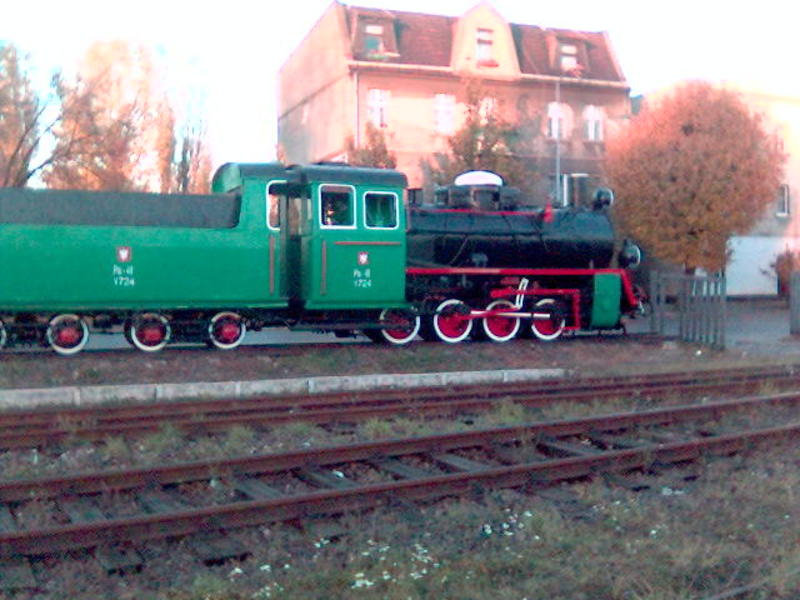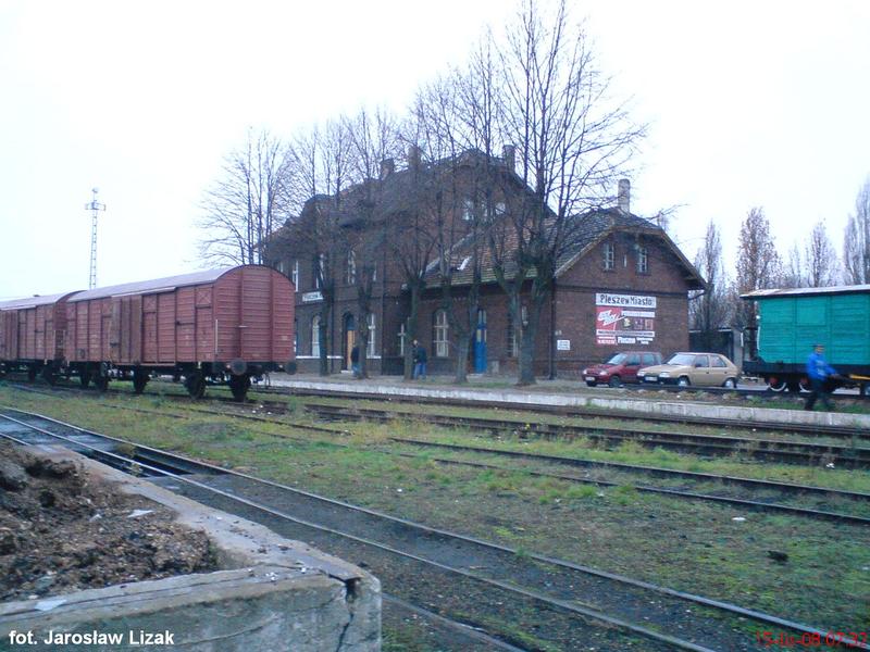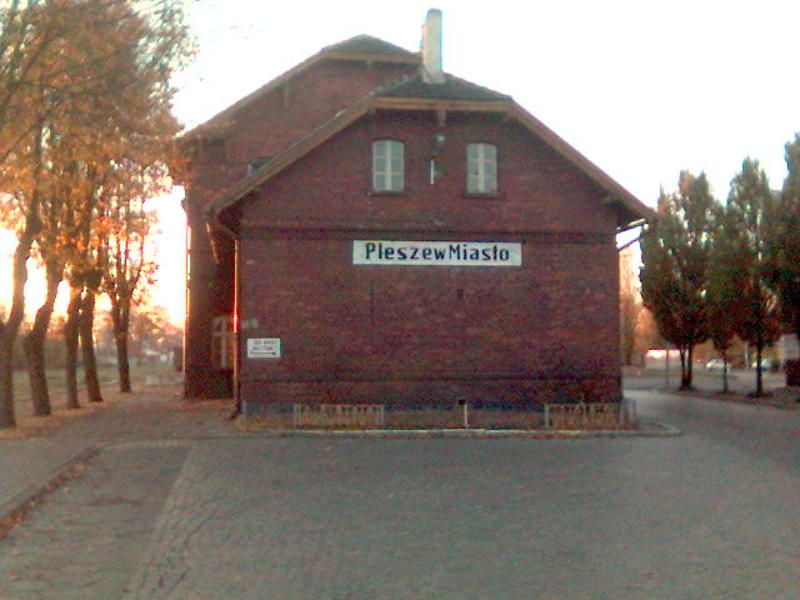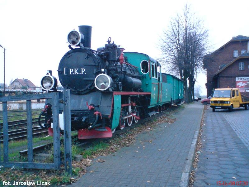 Stacja Pleszew Miasto. Widok na ciuchcię zabytek. Za ciuchcią ulica Kolejowa prowadząca w prawo do ul.Sienkiewicza. Potem w lewo do Rynku, a w prawo do rozwidlenia dróg na Katowice i Taczanów.