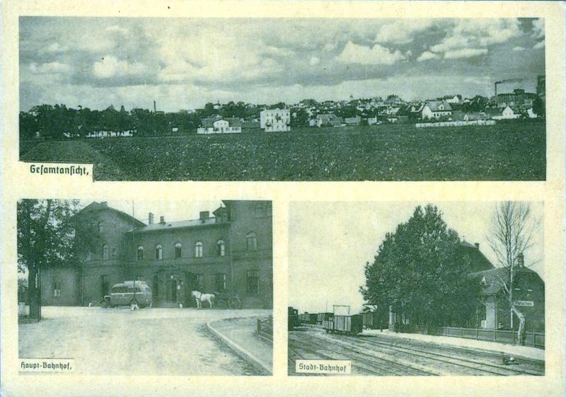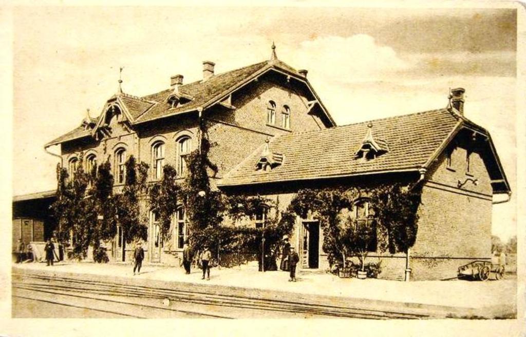 Budynek dworca w prawym dolnym rogu pocztówki.
