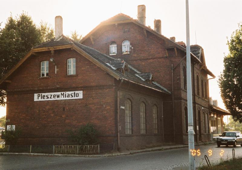 Stacja Pleszew Miasto - na lewo plac ładunkowy, na dalszym planie budynek stacyjny z przyległym magazynem towarowym oraz lokomotywa Lyd1-210 z pociągiem MS 7414 relacji Pleszew Miasto - Pleszew Wąskotorowy. Widok w kierunku stacji Broniszewice.