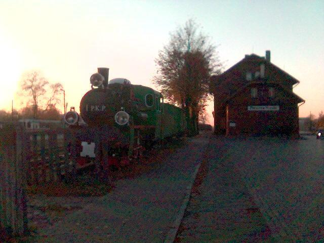 Stacja Pleszew Miasto. Już jest późno, słońce zachodzi, a tego dnia było bardzo zimno.