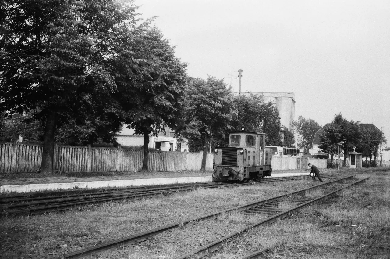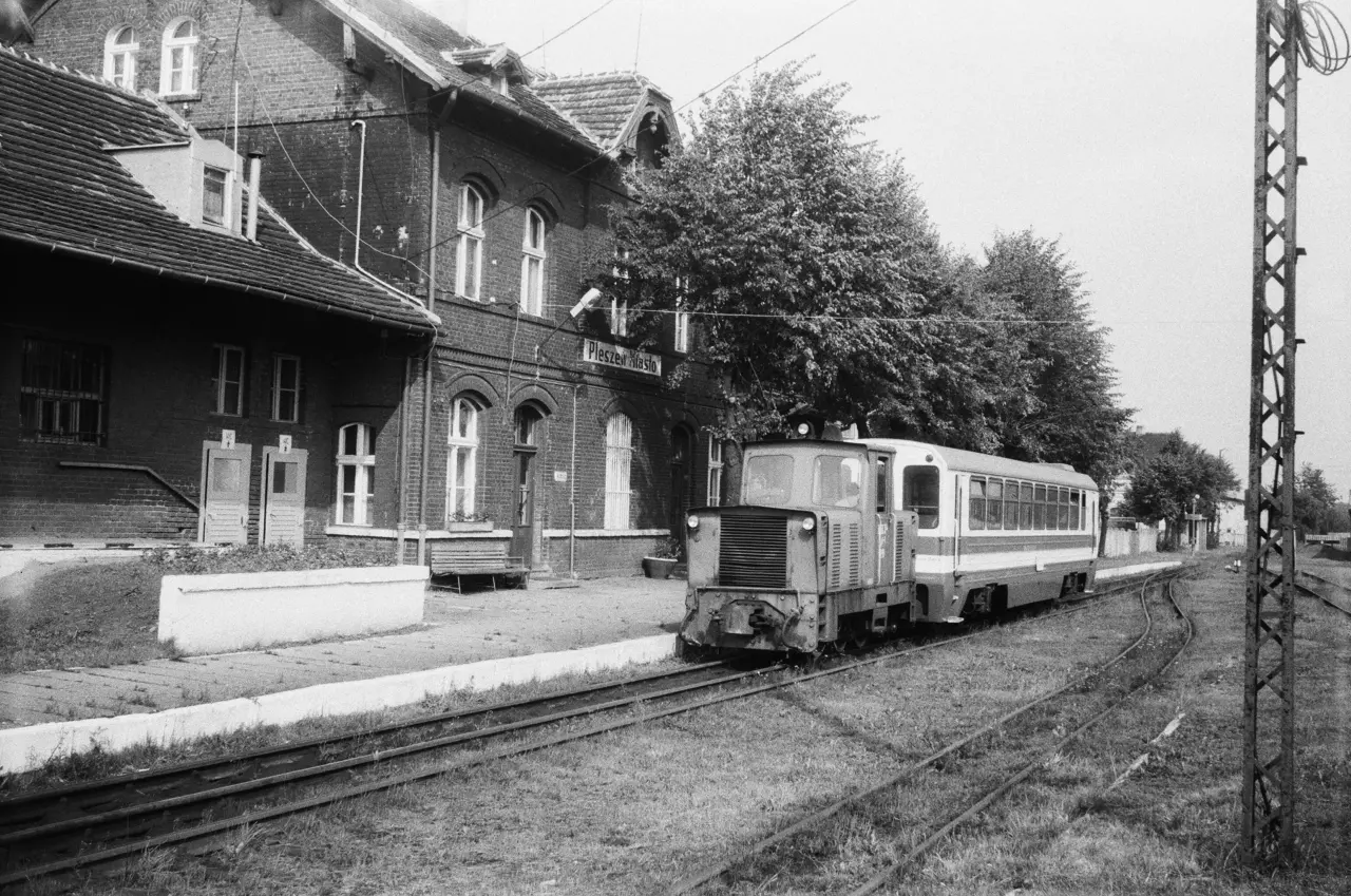 Stacja Pleszew Miasto - budynek stacyjny, pociąg MS 7416 relacji Pleszew Miasto - Pleszew Wąskotorowy, prowadzony lokomotywą Lyd1-219, widok w kierunku stacji Broniszewice (odcinek rozebrany).