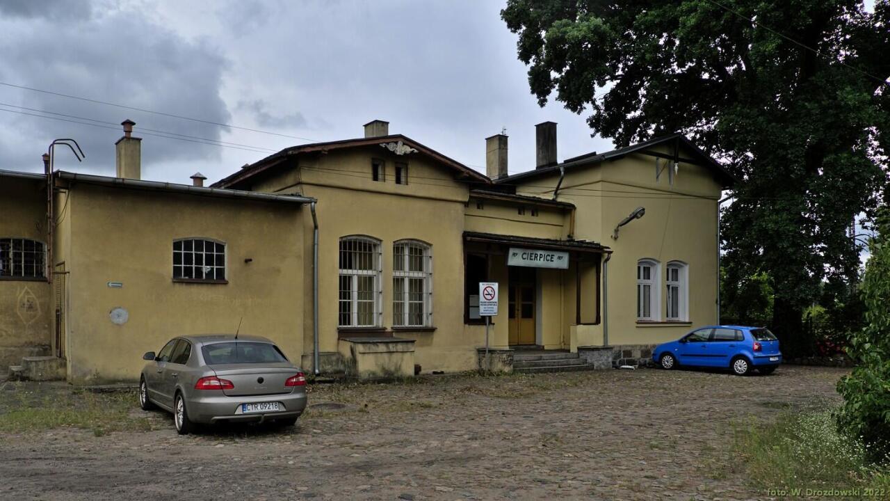 Budynek dworca od strony peronów i wjazdu z Bydgoszczy. W centralnej części budynku (po prawej) mieści się nastawnia dysponująca.