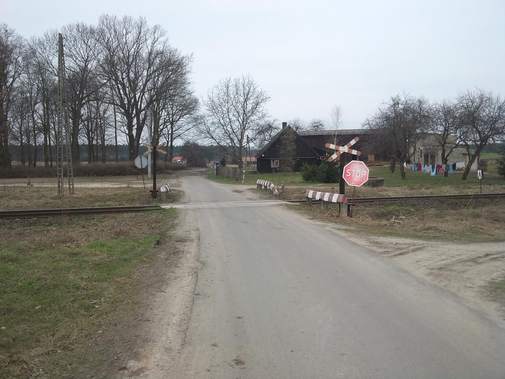Przejazd kolejowy na wjeździe z Bydgoszczy (z prawej); w lewo peron.