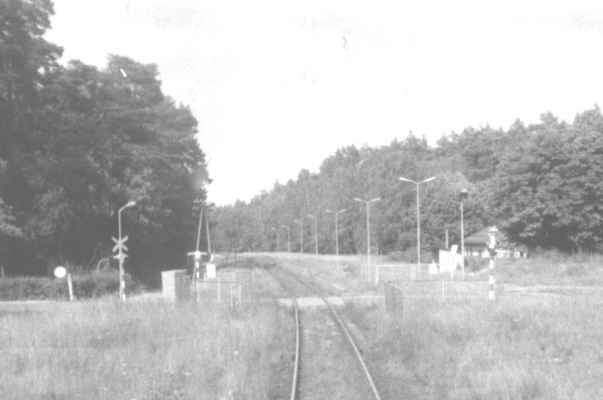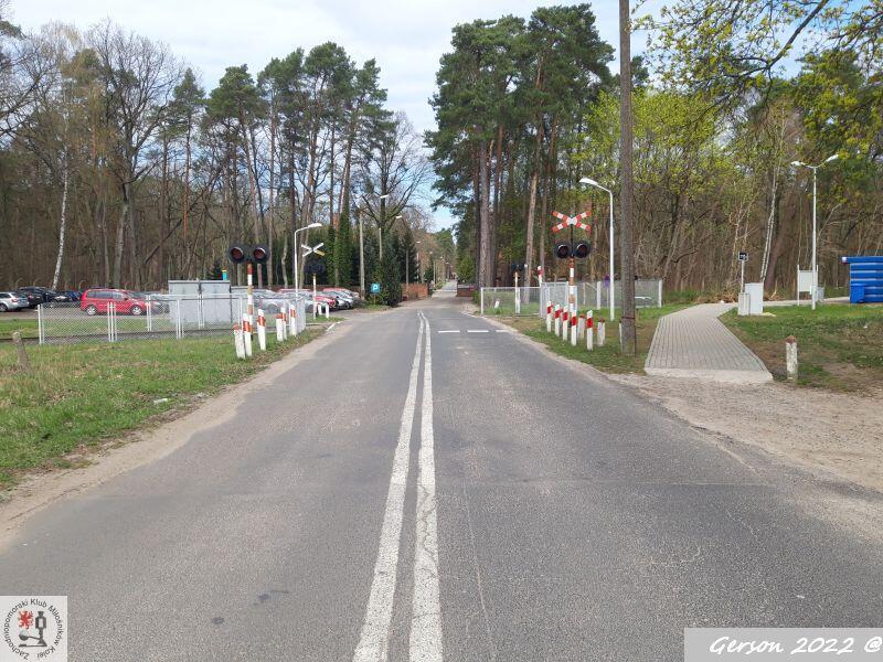 Przejazd kolejowy w Mostach. W tle wjazd do jednostki wojskowej. W lewo Goleniów/ Port Lotniczy Szczecin Goleniów, w prawo Nowogard.