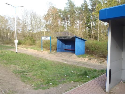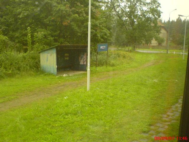 Mosty: widok ogólny w kierunku Goleniowa, od lewej: budynek stacyjny, słupy oświetleniowe, stara i nowa wiata przystankowa, a za prawym skrajem zdjęcia - jednostka wojskowa, do której dojeżdża się przez widoczny na zdjęciu przejazd kat. C.