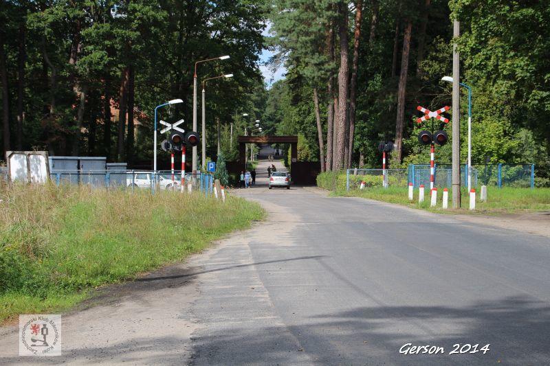 Przejazd kolejowy. W tle wjazd na teren jednostki wojskowej.