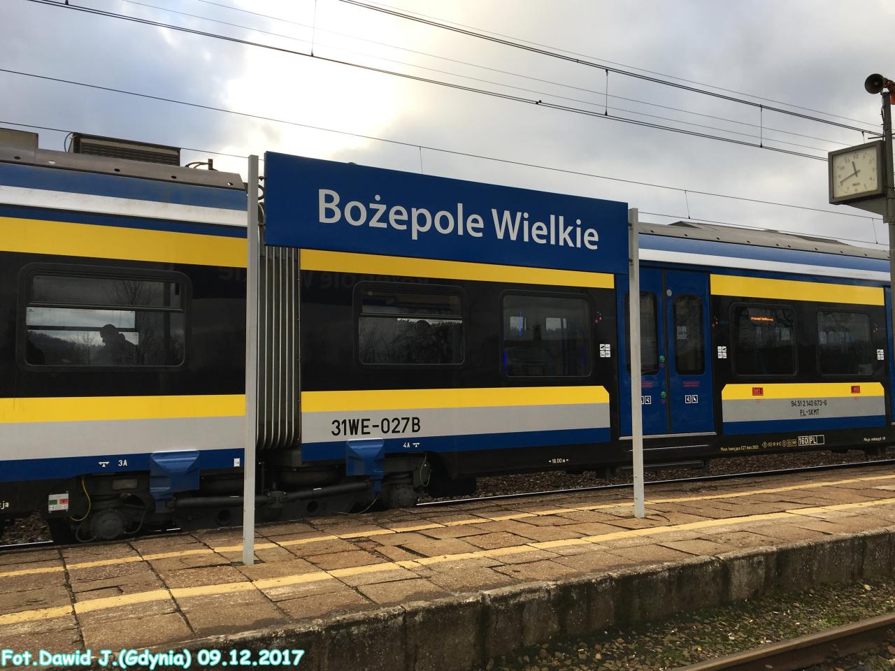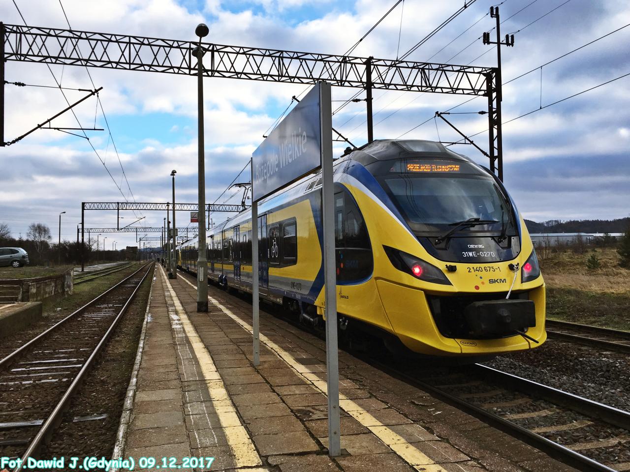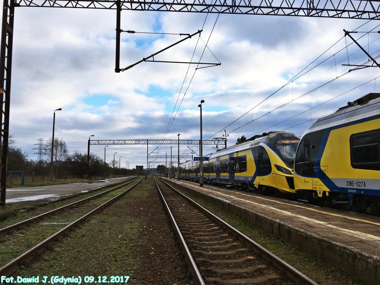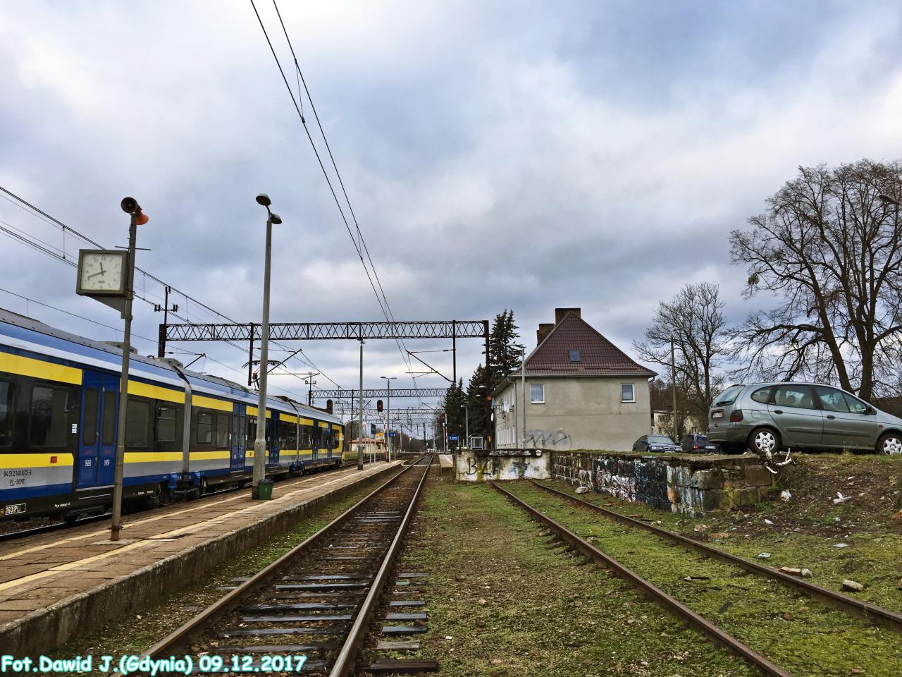 Widok z peronu 2 w kierunku Wejherowa/Gdyni Głównej. Tablica z nazwą stacji. Ostatni pożegnalny pociąg PKP SKM ze Słupska do Gdyni Chyloni.